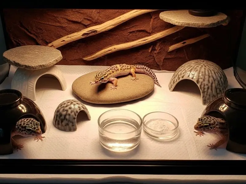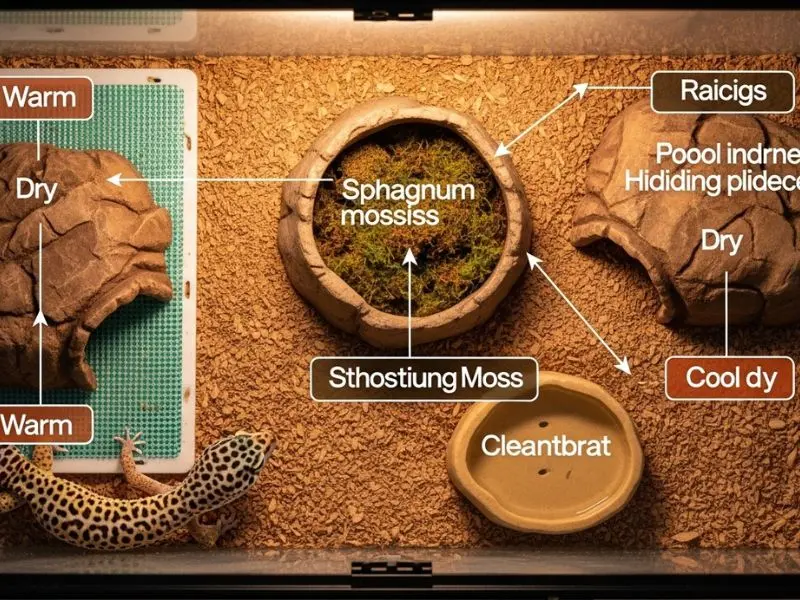 O gecko-leopardo não regula temperatura internamente — depende do ambiente. Por isso, o terrário precisa ter duas zonas distintas: