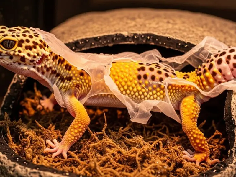 Alguns dias antes da muda, a pele do gecko-leopardo fica opaca, acinzentada, sem o brilho normal. Os olhos ficam levemente nublados. O gecko para de comer e fica mais retraído — esse é o momento de garantir que a hide box úmida está bem umedecida.