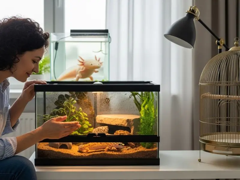 Tutor observando diferentes pets exóticos em um ambiente doméstico organizado e acolhedor,pets exóticos, animais exóticos domésticos, guia pets exóticos, terrário doméstico, criação responsável