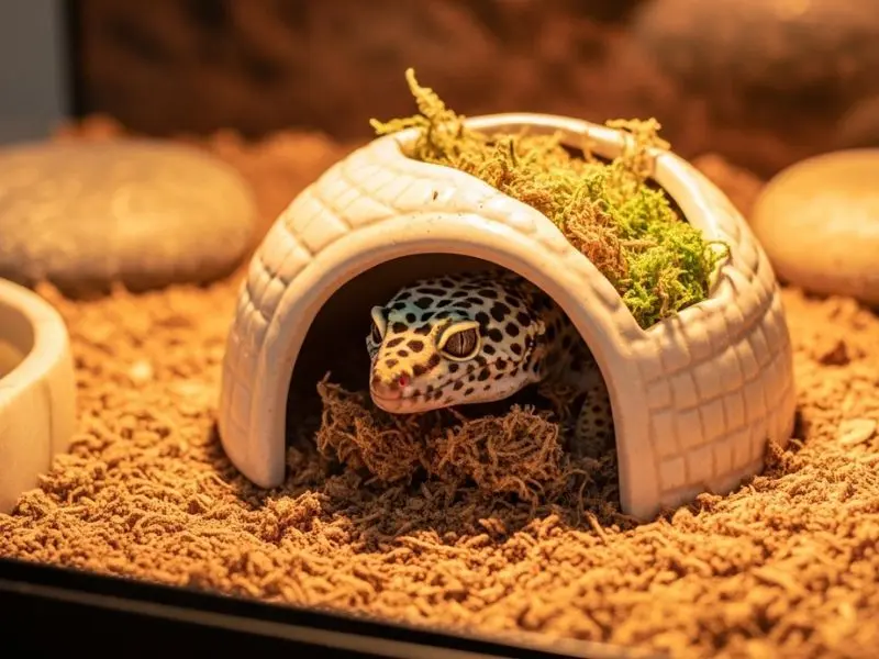 “Essa esconderijo de cerâmica com musgo úmido custou R$ 40. Salvou os dedos da Luna na primeira muda. Hoje é item obrigatório no terrário deles. 🦎” –>