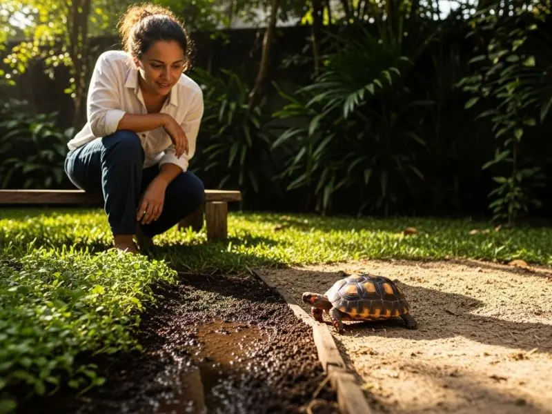A Jade, minha jabuti-piranga, vive nessa faixa. O interessante é que ela precisa de gradiente no próprio espaço: uma área mais úmida onde ela escava e descansa, e uma área mais seca onde come e toma sol. Ela dorme enterrada no substrato úmido quase diariamente — comportamento natural que só funciona porque a umidade está correta.